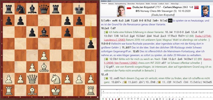 Die 745 ausgewählten kommentierten Partien bieten ein hervoragendes Studienmaterial. Topspieler wie Carlsen (1 kommentierte Partie), Andreikin (5), Anand (2), Adams (2), Duda (1), Eljanov (3), Firouzja (1), Gashimov (2), Giri (1), Harikrishna (1), Karjakin (1), Kasimdzhanov (3), Navara (2), Nepomniachtchi (1), Polgar (1), Radjabov (1), Wojtaszek (1) haben ihre Partien analysiert, dazu kommen Caro-Kann-Experten wie Lukacs (361), Postny (41), Sumets (29) und Roiz (21). Insgesamt sind es 9549 Partien, wobei der Ratingschnitt mindestens 2575 beträgt (außer kommentierte Partien und Partien von Spezialisten).